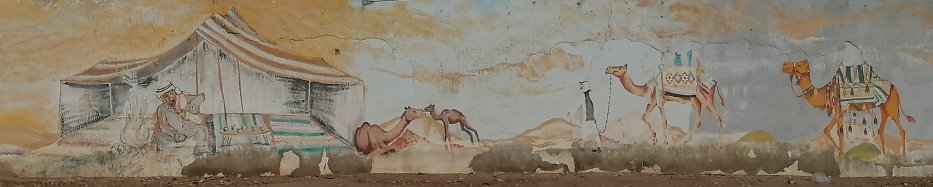 | An die Mauern sind viele Graffiti mit Szenen aus dem Leben der Beduinen gemalt. |