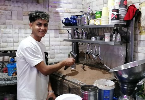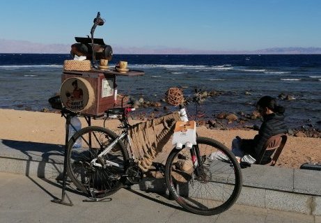 | Die mobile Kaffee-Bar am Fahrrad ist auch ein Geschäftsmodell. | Der Kaffee wird in heißem Sand zubereitet. |