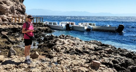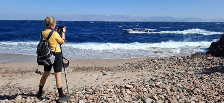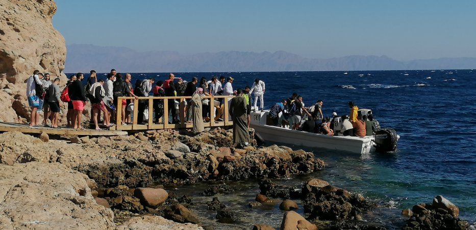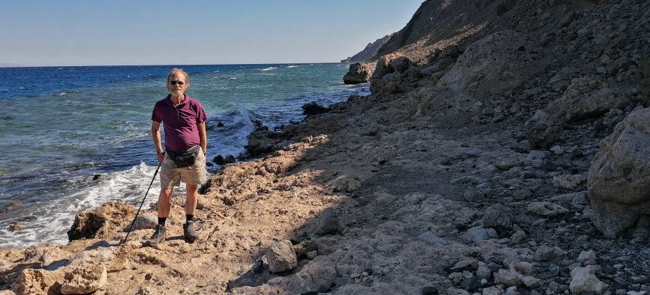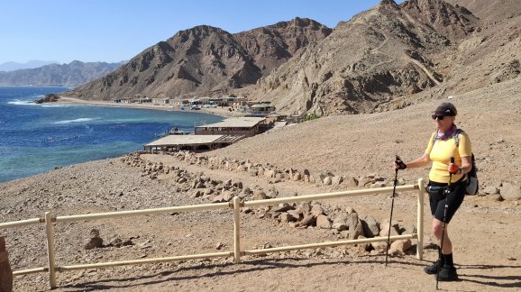 | Am Blue Hole starten wir die Wanderung nach Abu Galum. Wir wollen nicht wieder in einem Boot nass werden, daher wandern wir zwei Stunden entlang der Küste nach Abu Galum. | |