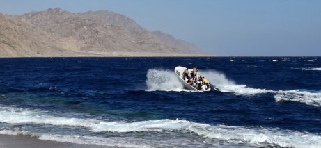 Booten nach Abu Galum. Die Paxe wissen noch nicht, wie nass sie gleich auf der Fahrt werden. |