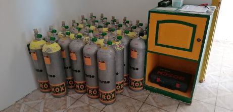 | Die Nitrox Ecke. | Die Kompressoren sorgen für genug Luft in den Flaschen. |
