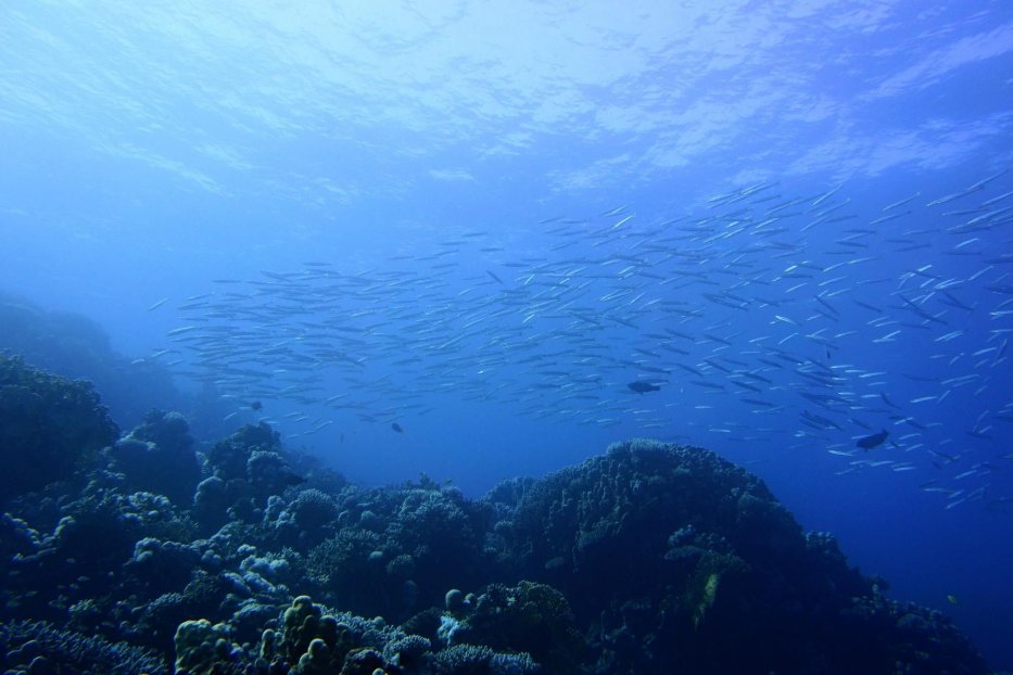 | Ein Schwarm junger Barracudas in Islands. |