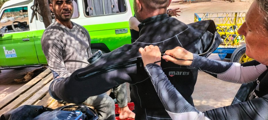 | Der Reißverschluss von Alis Trocki ist gleich zu und wir können zum Tauchgang starten. |