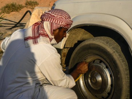 | Wir dürfen während der Fahrt hinten am Pickup sitzen. In Ägypten kein Problem. | Nach der Fahrt im Sand müssen die Reifen wieder gefüllt werden. |