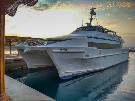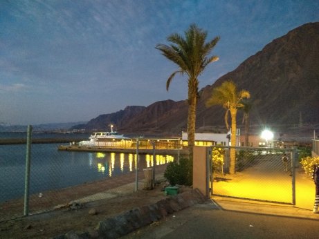 Sonnenaufgang in Taba an. Mit dem Katamaran setzen wir über nach Akaba in Jordanien. |