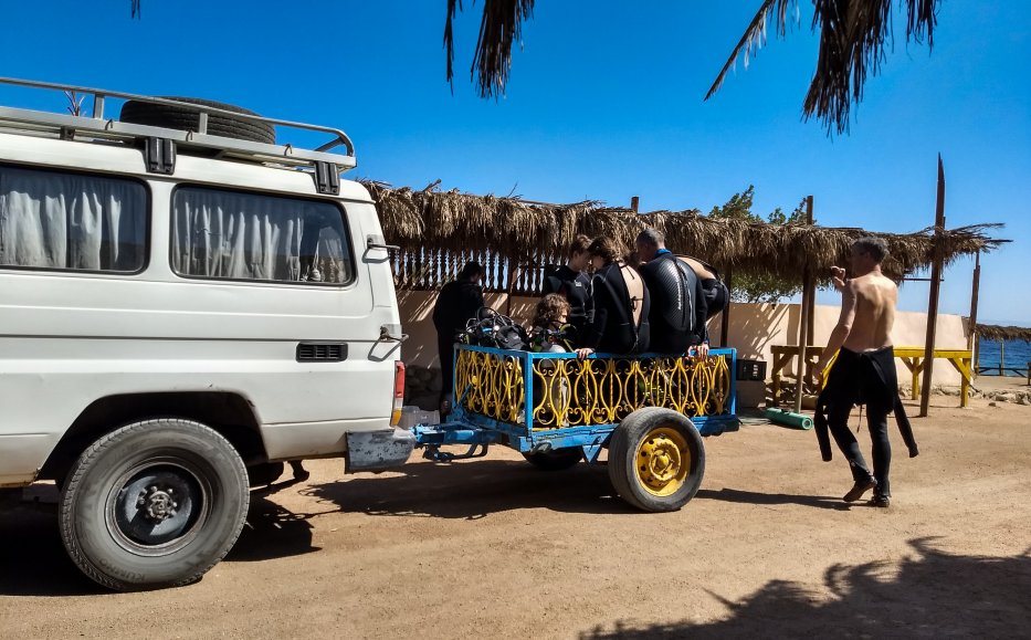 | Auf dem INMO Anhänger fahren wir zu den Dive Spots Caves und Um Sid. |