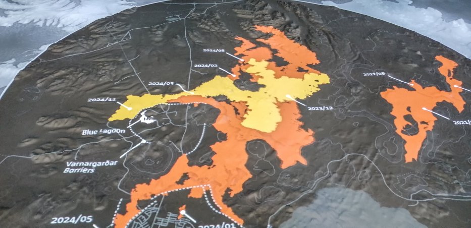Ausbrüche des Vulkans Fagradalsfjall von August 2022 bis 2025. Die strichlierten Linien markieren die aufgeschütteten "Lava Schutz Dämme". |