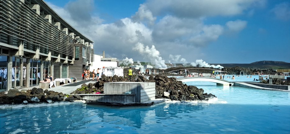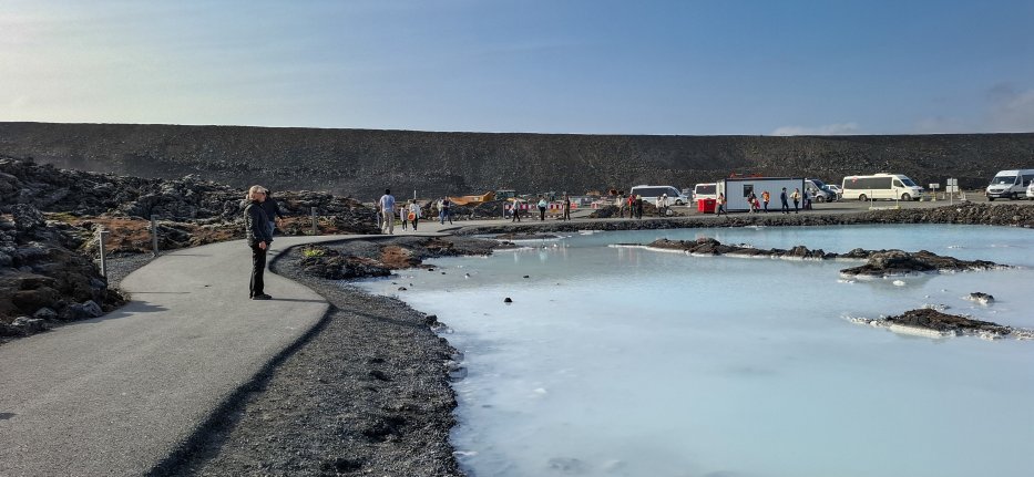 | An der Blauen Lagune sieht man im Hintergrund einen Lava-Schutz-Damm. |