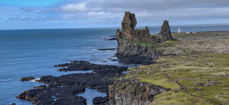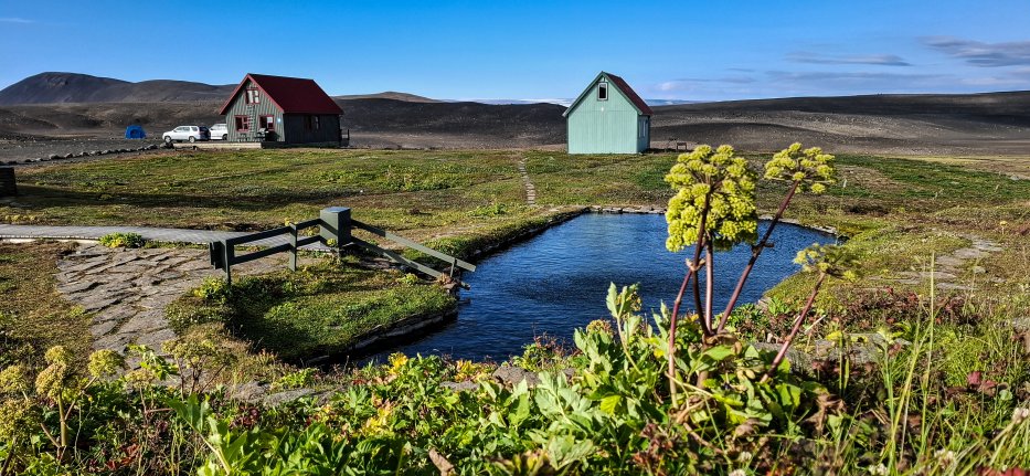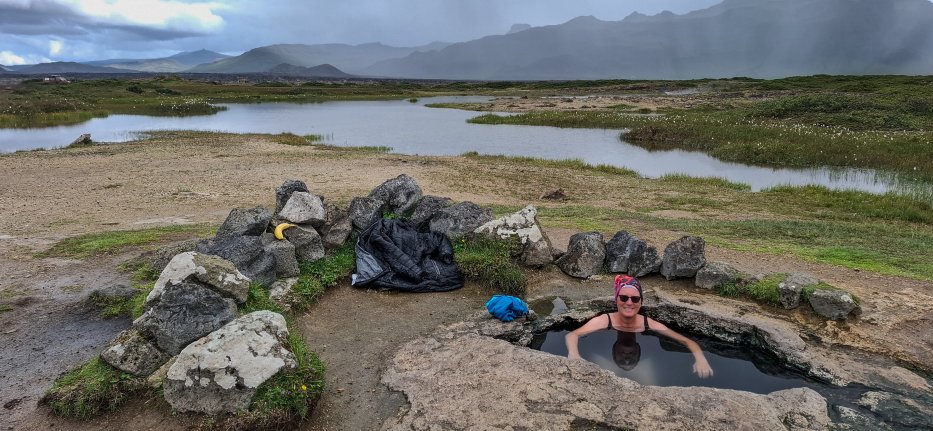 | Wir baden lieber in der Natur und finden eine Hot Spring. Diese kostet nichts und ist nicht so mondän wie die Blaue Lagune. | In Lóndrangar finden wir hinter einem alten Haus ein windgeschütztes Camp auf der Snæfells Halbinsel. |