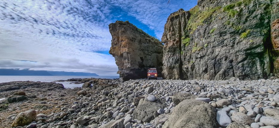 | Um die Halbinsel von Pingeyri herum fahren wir die Álftamýri Road zum Boulder Beach. | |