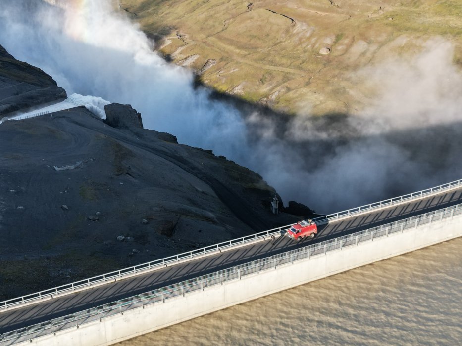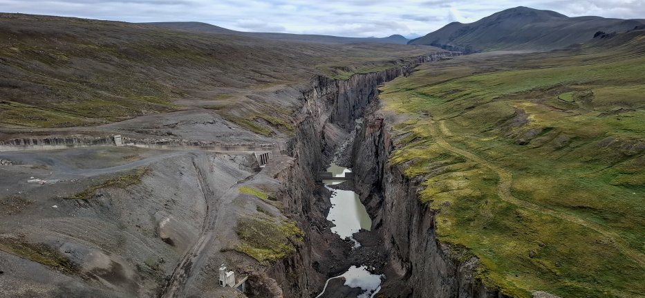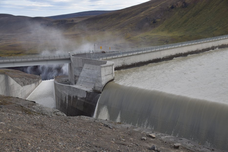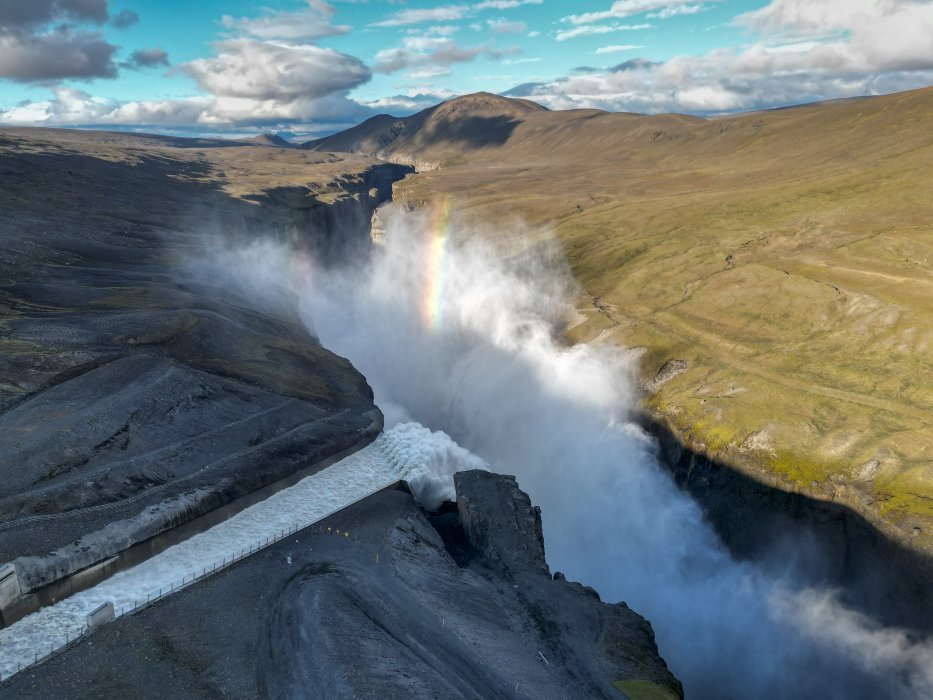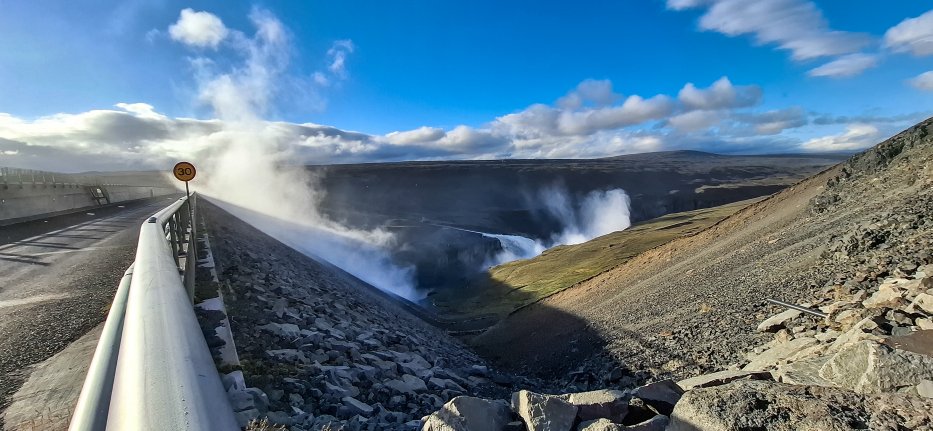 | Zurück auf der F910. Durch den vielen Regen im Jahr 2025 ist der Stausee Jökla voll und das Wasser schießt durch den Überlauf am 28.08.2025 in die Jökla Schlucht. |