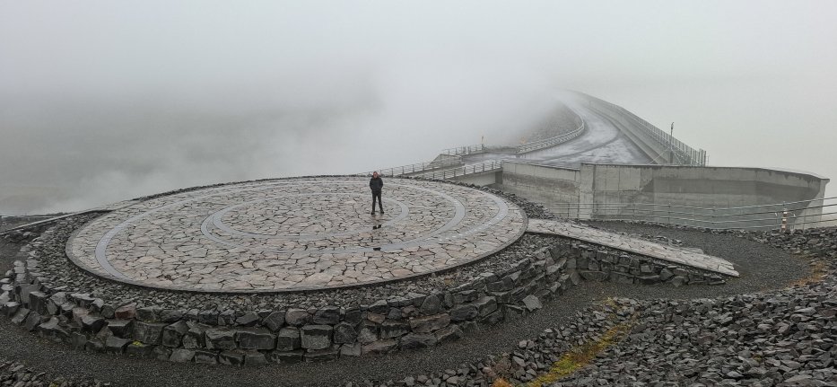 | Jökla Schlucht im Juni ohne Wasser am 19.07.2025. | Der Staudamm im Nebel. |
