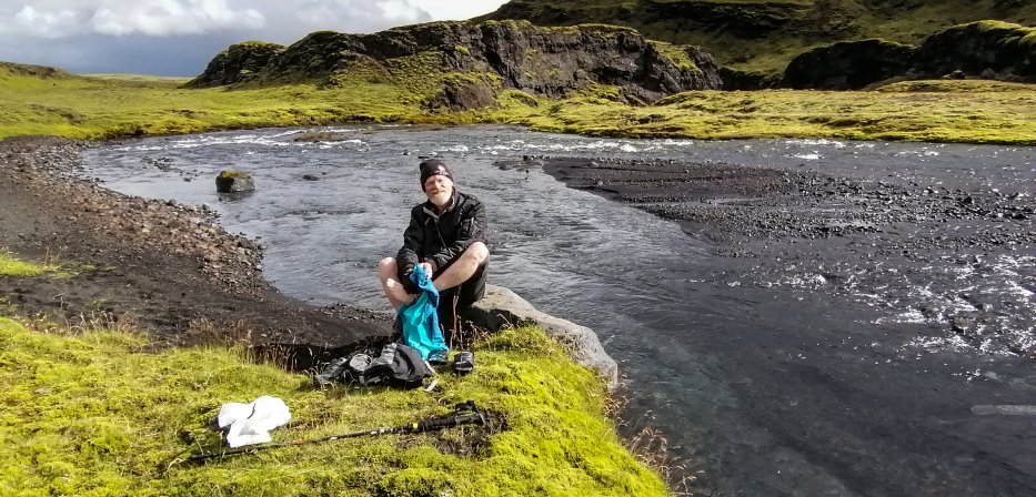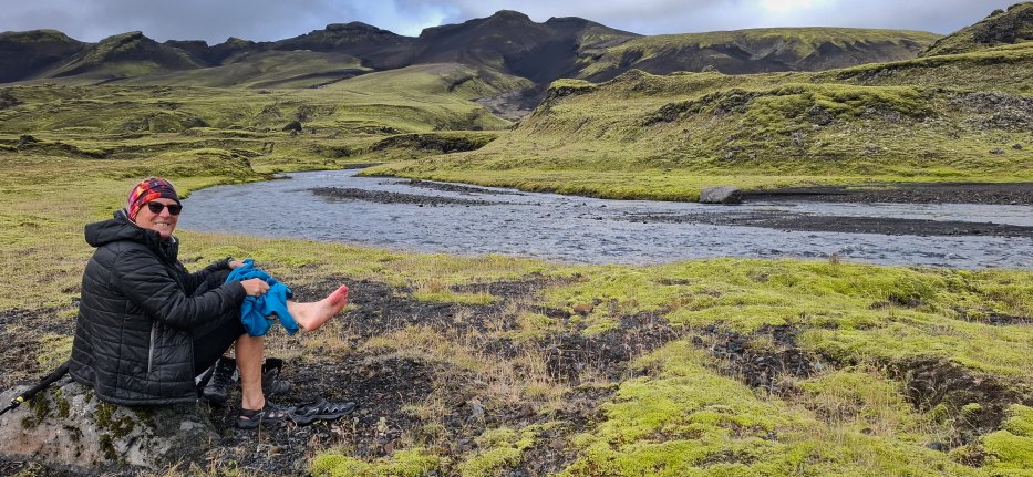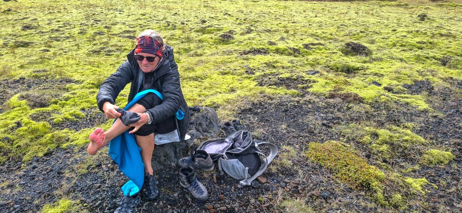 | Die Füße werden nach der Flussüberquerung getrocknet und es geht zurück zur Straße F208. |