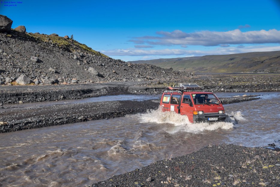| F249: Bei dieser Querung haben sogar Isländer zugesehen. Ich hatte alles richtig gemacht. Nicht gegen die Strömung fahren, die großen Steine im Auge behalten, am Vormittag fahren und die großen Wellen meiden, weil dort die größten Steine unter Wasser sind. Nur 5 km/h mit der Untersetzung bei 1.800 RPM. Das Einzige das ich heute noch machen würde, wäre vor der Durchfahrt ein Abschleppseil am Abschlepphaken am Unterboden zu befestigen. Im Notfall ist es unmöglich ein Seil unter Wasser einzuhängen. |