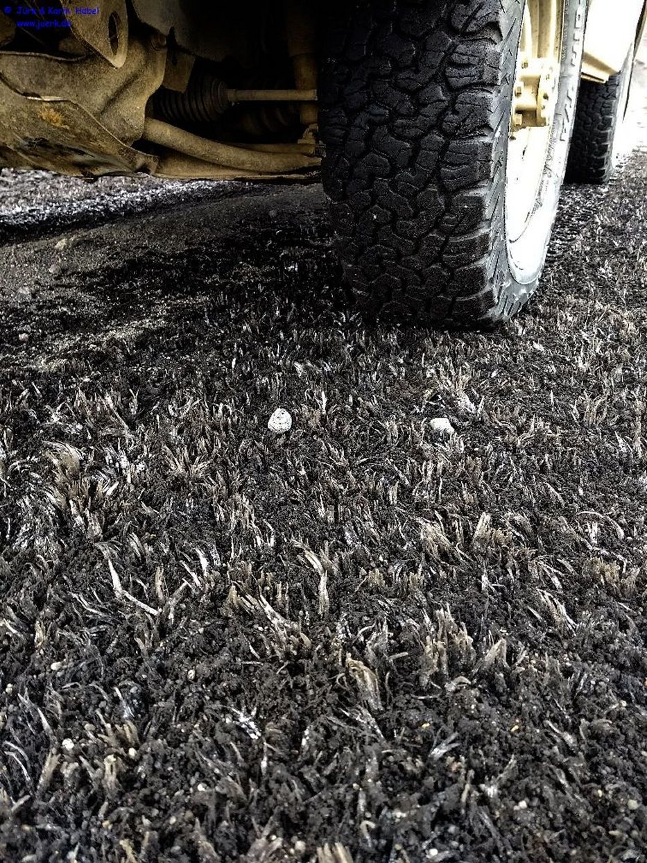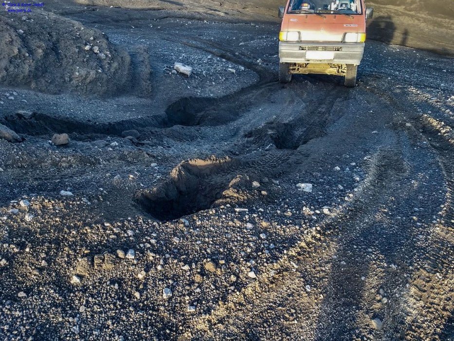 verteilt. Da hilft nur den Reifendruck zu reduzieren und danach mit dem Kompressor die Reifen wieder aufblasen. Im Sand 1,0- 1,2 Bar, im Lavafeld 2,2 Bar, am Asphalt 2,8 Bar.