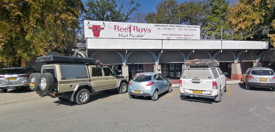 | In Maun besorgen wir uns Permits für das Okavango Delta und die Campsites in Moremi. Danach kaufen wir uns Biltong bei den "BeefBoys" und füllen die Kochkiste und Kühlbox wieder auf. |