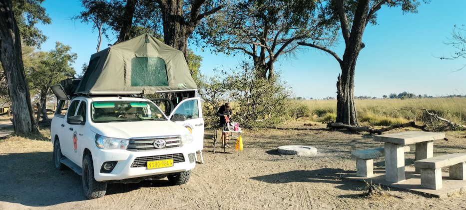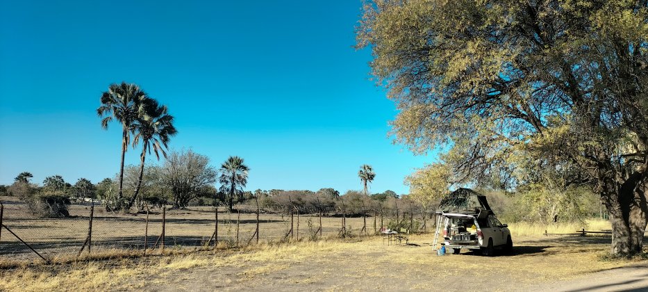 | Unser Lieblings-Campsite im Sedia Hotel ist noch frei und wir genießen den Abend unter der Akazie. |
