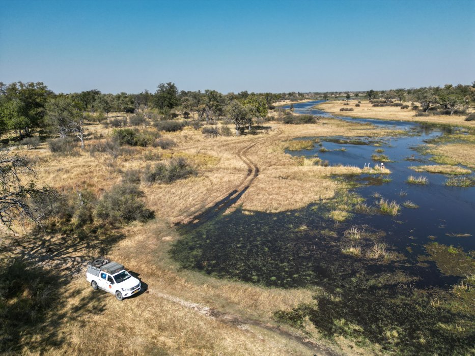 | Ich packe die DJI -Drohe aus und suche einen fahrbaren Weg am Seitenarm des Okawango von oben. |