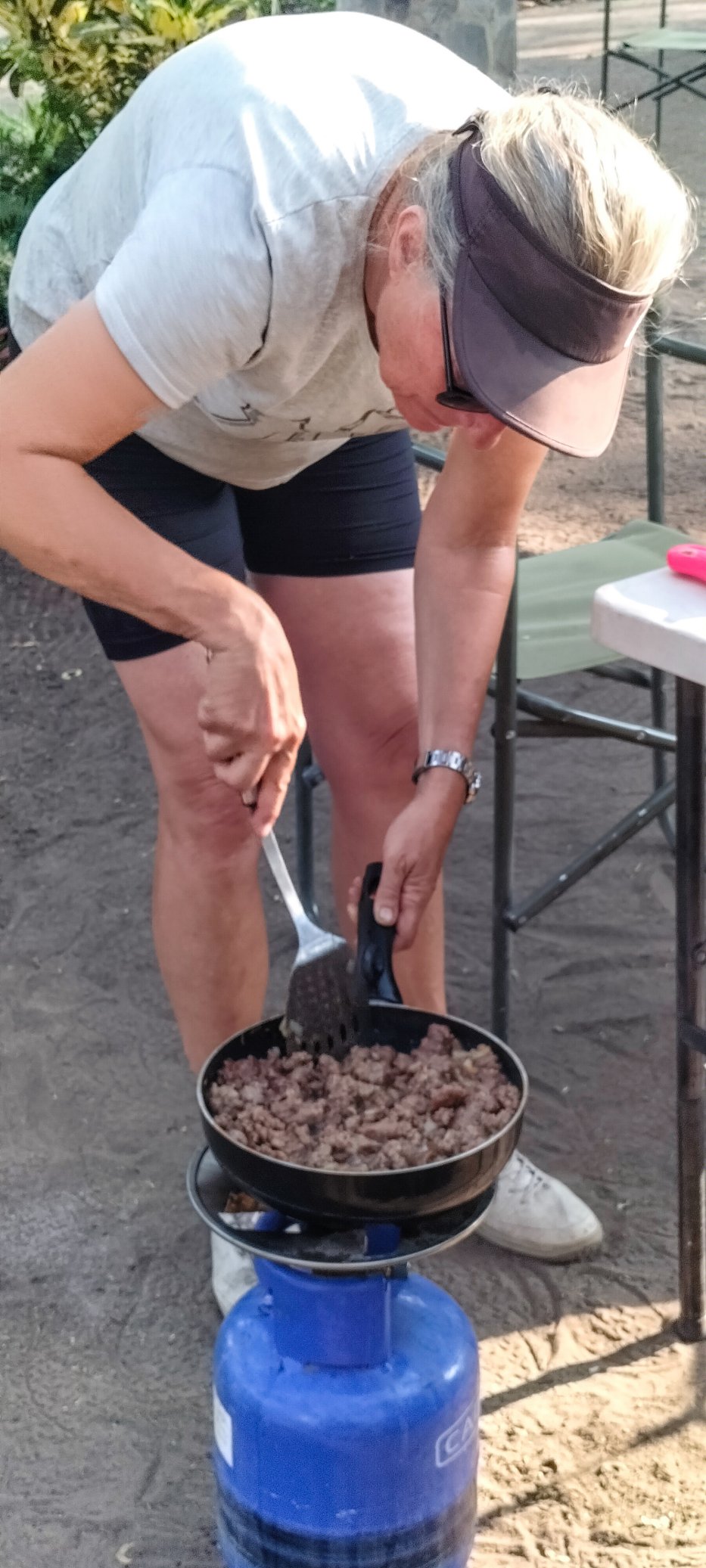 Dämmerung sitzen wir ganz entspannt am Camp Site, als ich Löwen-Gebrüll am