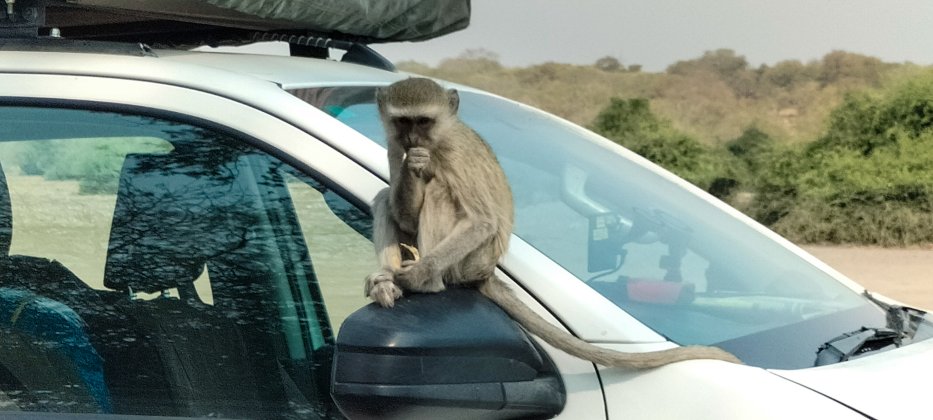 | Ein Kapuzineräffchen turnt auf dem Spiegel vom Hilux. | |