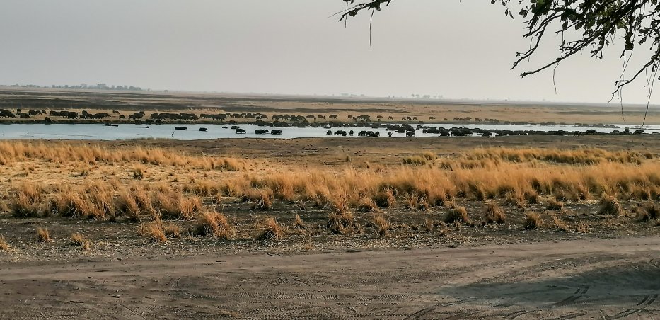 | Am Morgen wachen wir vom trampeln von hunderten von Hufen auf. Eine Büffelherde mit mindestes 600 Tieren überquert den Chobe River von Sambia nach Botswana. |