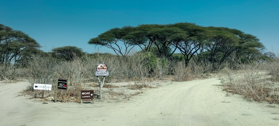 sind nur noch unverschämt), entscheiden wir uns für ein anderes Camp. Wir hören von einem Camp am Rande des National Park. "Chobe Hide Away" klingt verlockend und ist wirklich Hide Away. Der Wegweiser und das GPS helfen uns das Camp zu finden. |