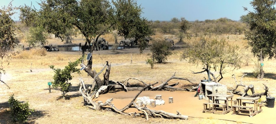 | Wir sitzen hier ganz entspannt und verfolgen die Giraffen- und Elefantenherden die tagsüber am Wasserloch vorbei ziehen. |