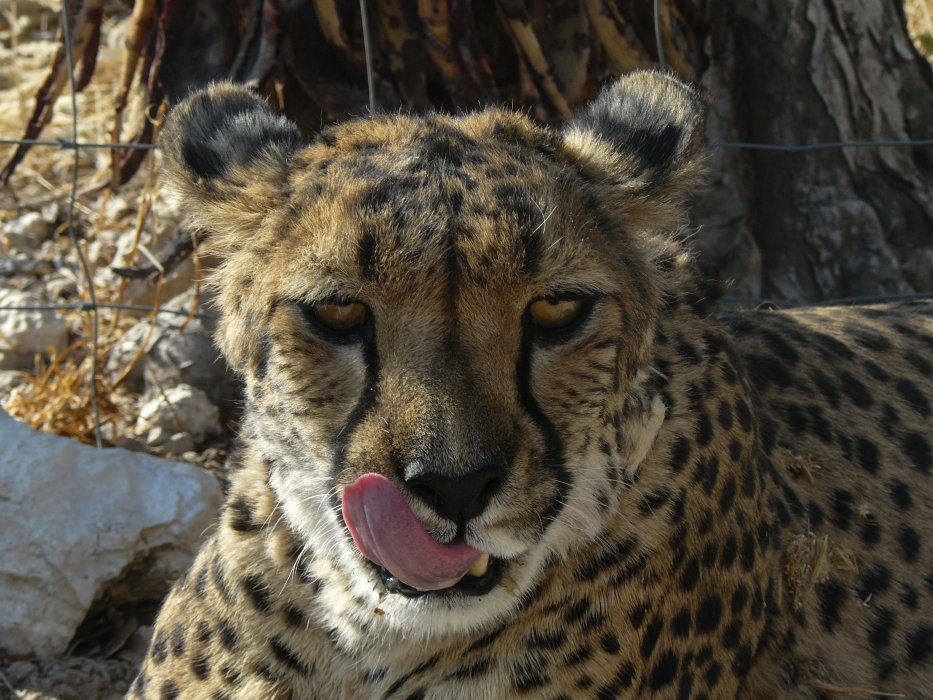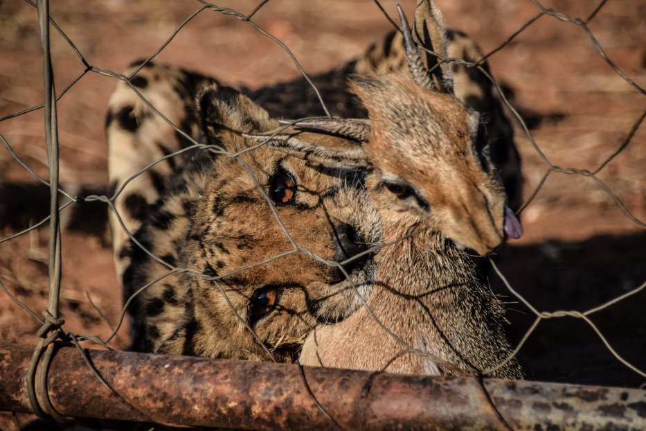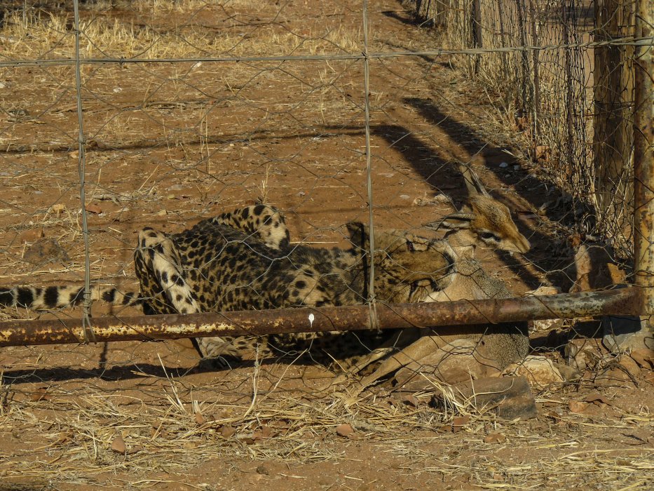 | Sogar für den Farmer war es eine Überraschung. Einer der wilden Cheetahs hat ein kleines Kitz an der Ecke des Zaunes gerissen, das sich in das Gehege verirrt hatte. |