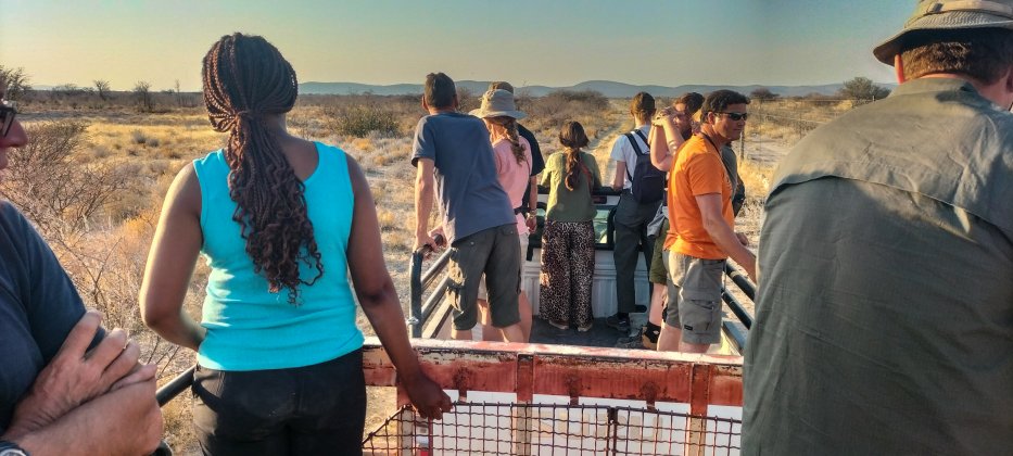 | Die wilden Cheetahs haben Haustiere gerissen, wurden aber von den Farmern nicht erschossen, sondern eingefangen und zur Familie gebracht. Dort sind sie nun in einem großen Gehege untergebracht. Wir können mit einem Pickup am Hänger durch das Gehege fahren und die wilden Cheetahs bei der Fütterung besuchen. |