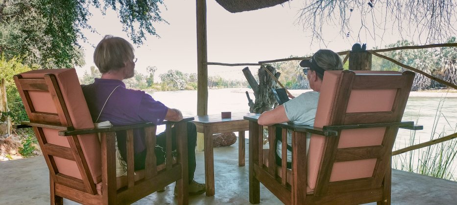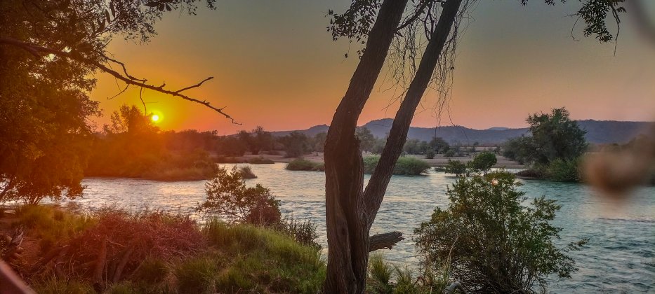 | Zurück im Camp genießen wie den Abend am Kunene Fluß. Die Temperatur fällt abends auf angenehme 29 Grad. |