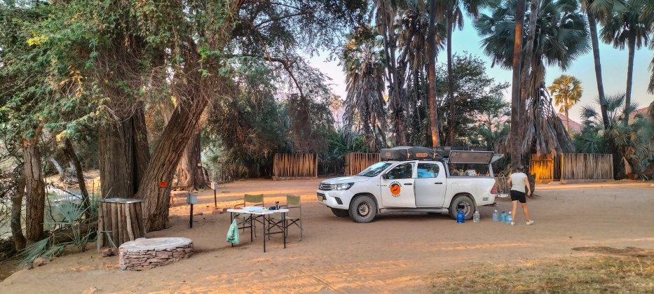 | Wir kommen zu den Epupa Falls. Ganz im Osten finden wir noch ein Camp das noch ein Site frei hat. |