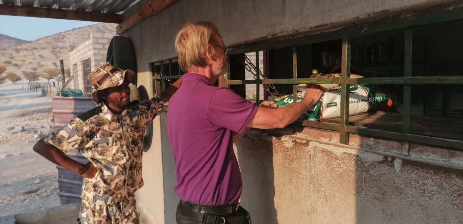 schon einmal in einem Himba Dorf. http://www.pc1ha.franken.de/habel/reisen/Namibia_Kaokoveld_2013/03_HimbaVillage.htm Auch diese Jahr wollen wir dieses Dorf besuchen. Wir finden einen Guide, der aber keine Verwandten im Dorf hat, das wir 2013 besucht haben. Daher besuchen wir nun die Ohajuua Comunity. Im Epupa Shop besorgen wir Mehl, Öl, Zucker und weitere Lebensmittel als Gastgeschenke. |