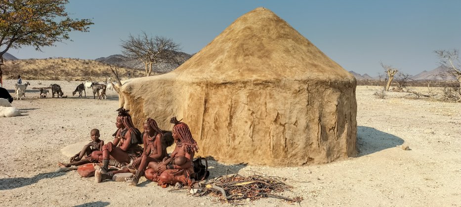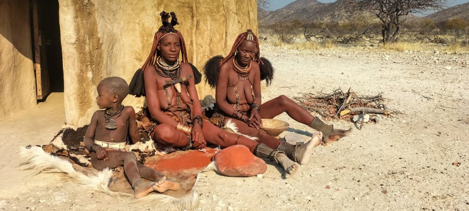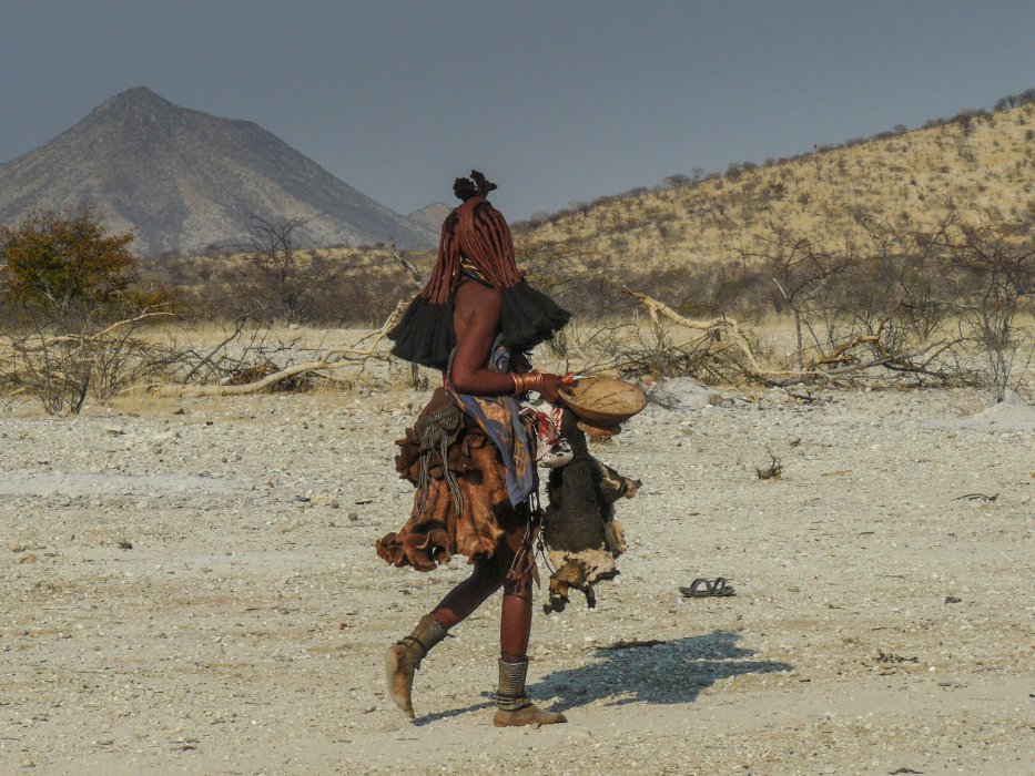 | Wir finden die Frauen von ihren Hütten. Sie pulverisieren Ocker-Steine, das sie vermischt mit Fett für ihre Körperpflege verwenden. | |