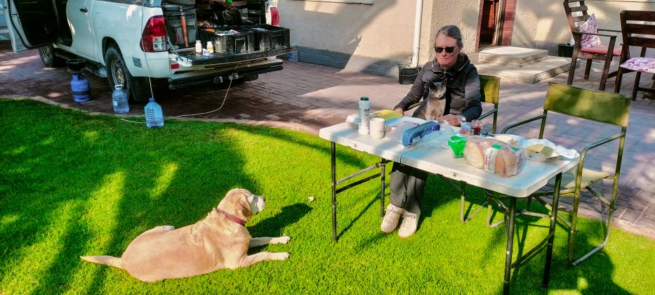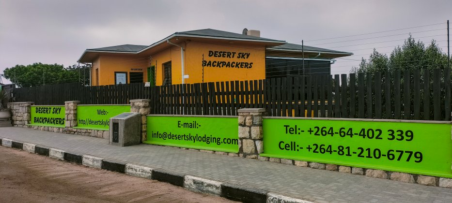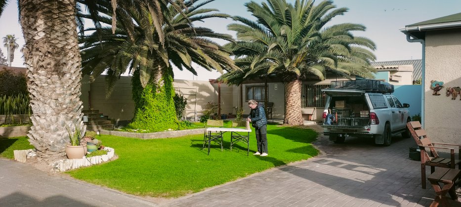 | Im Hinterhof des "Desert Sky Backpackers", fast zu Zentrum von Swakopmind, bekommen wir noch einen tollen Stellplatz. Mit Schatten, Sonne, Palmen und grüner Wiese campen wir hier nun 7 Tage. |
