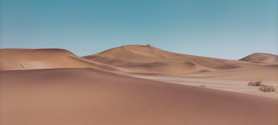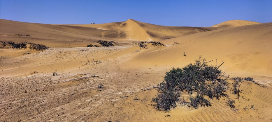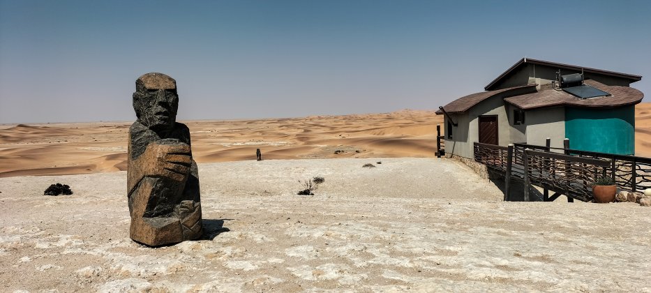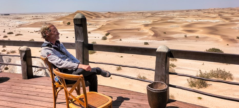 | Gleich hinter Swakopmund beginnt die Dünenlandschaft der Namib. Wir erkunden die Peripherie und besuchen eine Hotellobby mit tollem Blick auf die Wüste und besichtigen die angeschlossenen Bungalows. | |