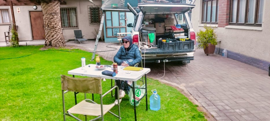 Tagestemperatur nicht über 15 Grad. An den kühlen Abenden können wir dann die Küche und Aufenthaltsraum des Backpackers nutzen. So genießen wir einige Abende mit einem österreichischen Paar, die hier ihren Reise-LKW reparieren. |