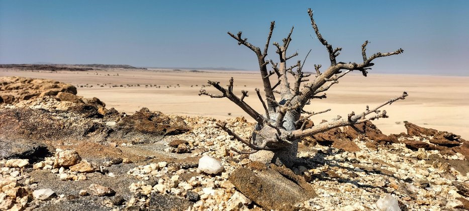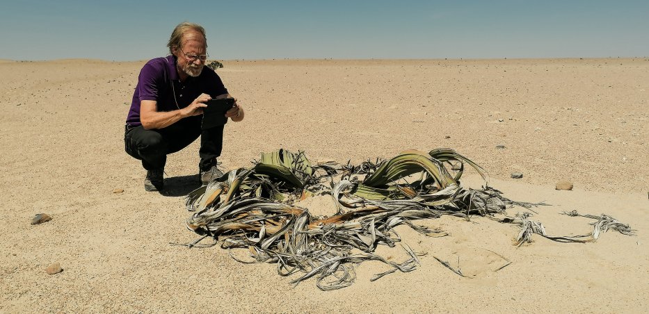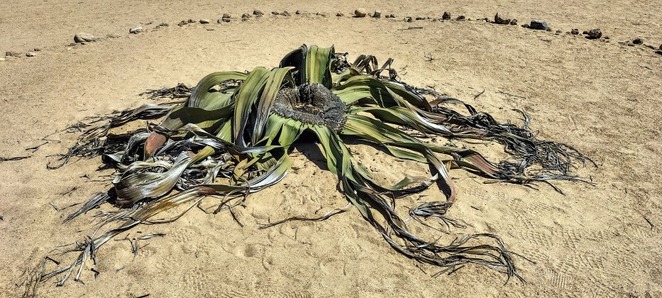 | Abseits der Hauptstraße finden wir urtümliche Pflanzen, die "Welwitschia mirabilis". Sie können bis zu 1.500 Jahre alt werden und haben nur zwei Blätter, die aber ihr Leben lang wachsen. | |