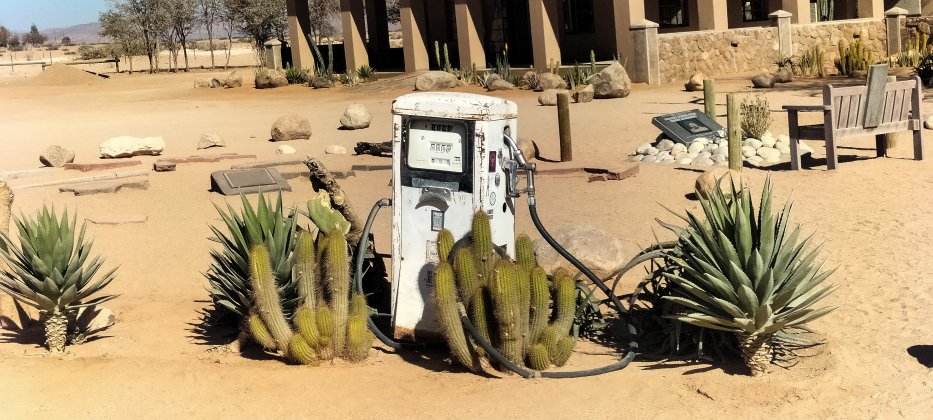 | Der Apfelkuchen in Solitaire ist weltberühmt. | 1995 habe wir noch unseren Hilux mit dieser Pumpe betankt. Strom gab es noch nicht, dafür eine Handkurbel. |