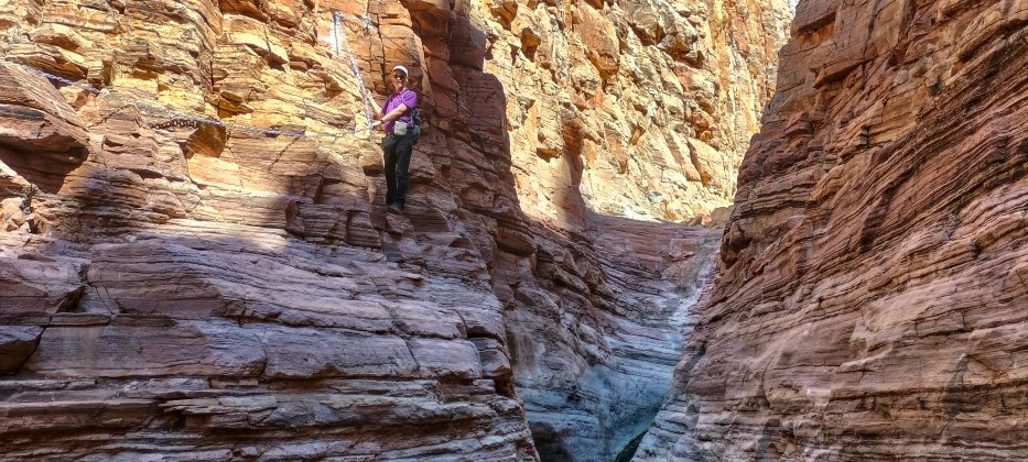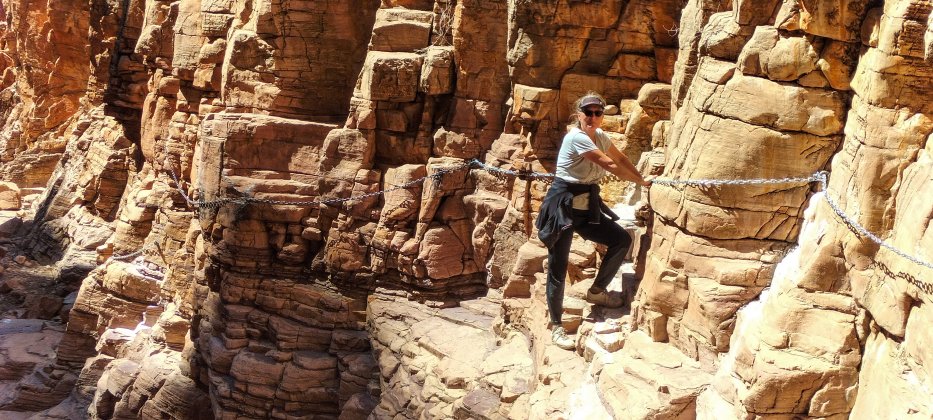 | Die Schlüsselstelle ist ein Abschnitt ganz am Ende der Wanderung, der mit Ketten gesichert ist. Wir hängen über der Schlucht. | |