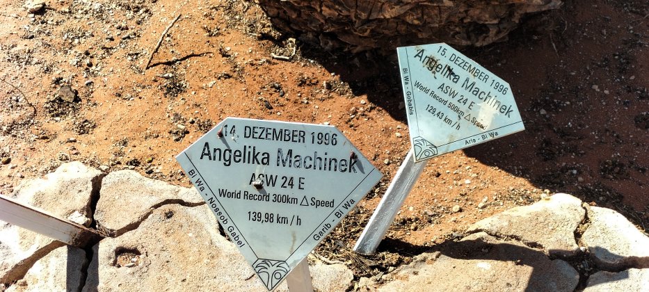 | Wir suchen an den beschrifteten Palmen von Pilotinnen und Piloten nach Namen die wir kennen und finden tatsächlich einige . Bekannt ist natürlich Angelika Machinek die hier viele Rekorde geflogen ist. | |