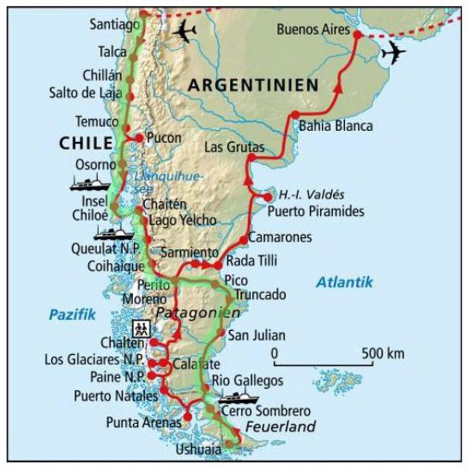 Stunden. Danach entlang der Straße "Carretera Austral" In Perito Moreno wechseln wir auf die Atlantik Küste. Über San Julian geht es zur Magellan Straße, wo wir mit einer Fähre übersetzen. In Feuerland angekommen fahren wir zu unserem südlichsten Punkt nach Ushuaia. |