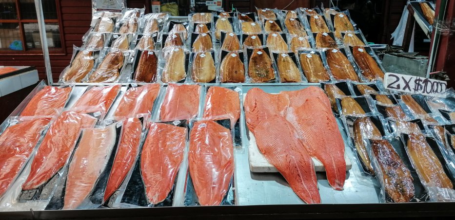 | Lachs aus den Lachsfarmen und Krabben gibt es im Angebot. | |