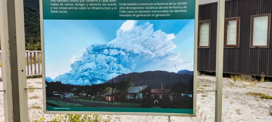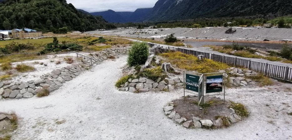| Am 2. Mai 2008 brach der Vulkan Chaitén überraschend aus. Aschemassen verschütteten Häuser und ein verheerender Lahar schießt mit bis zu 100 km/h in das Tal. Der halbe Ort Chaitén wird zerstört. |