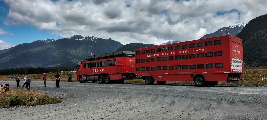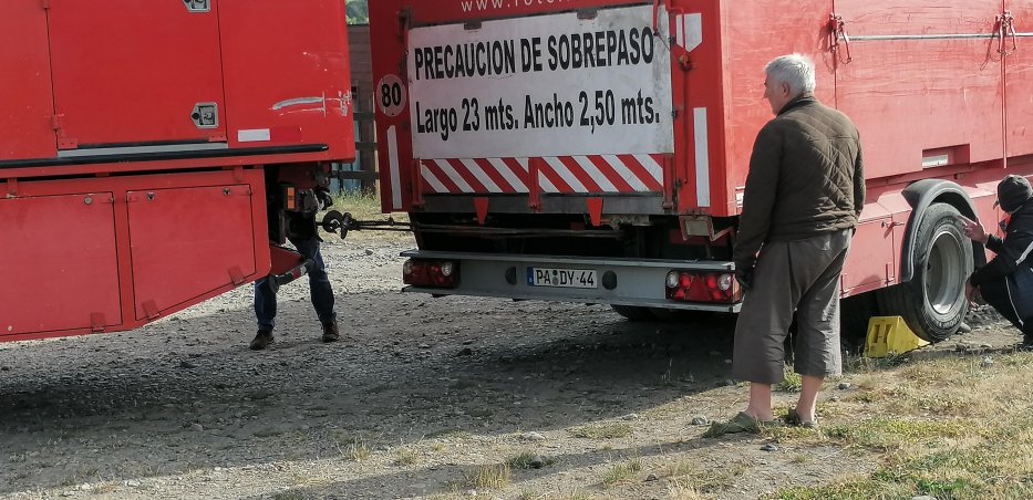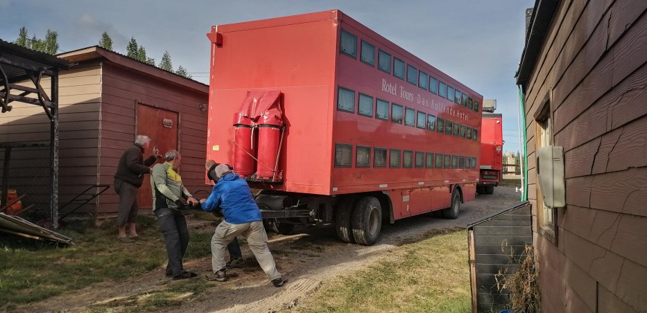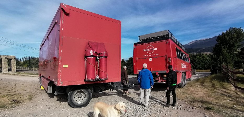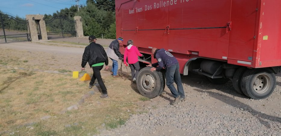 | Das Campsite von Perito Moreno ist so eng, dass wir den Anhänger abhängen müssen und mit einem Stahlseil rückwärts wieder aus dem Stellplatz ziehen. Die kräftigsten Männer lenken and der Deichsel. | |