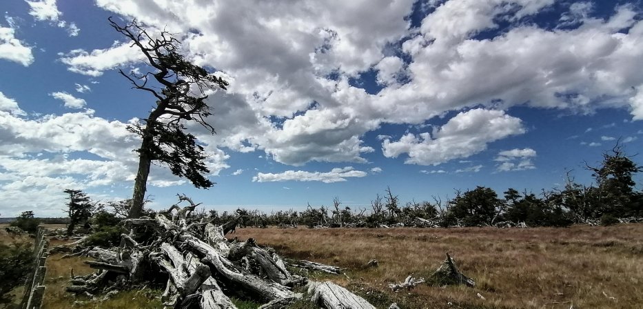 | Die Landschaft ist vom ständigen, starken Wind kahl gefegt. |