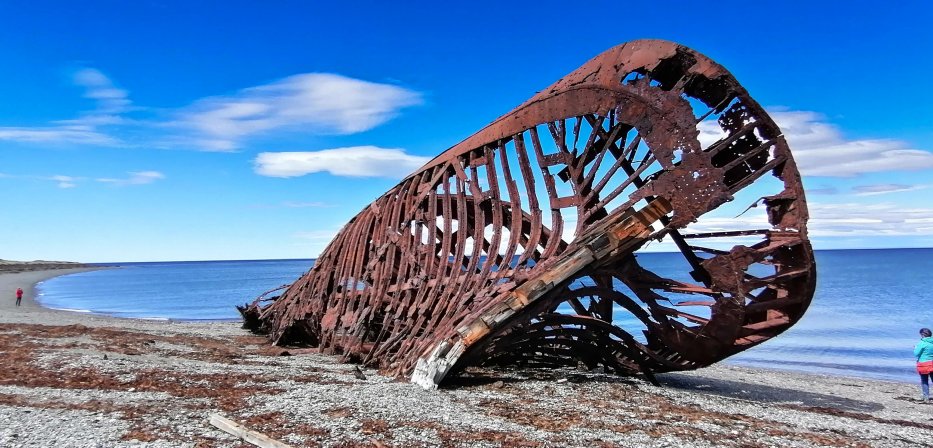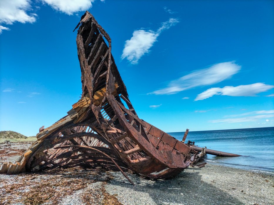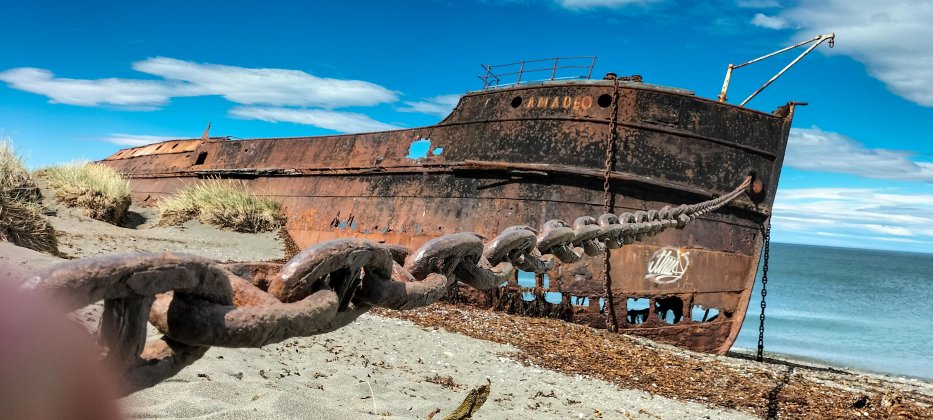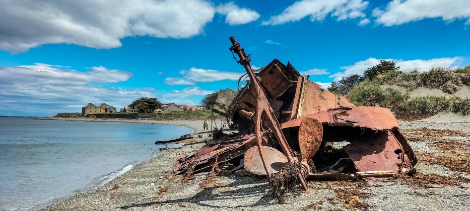 | Die Magellanstraße ist ein gefährliches Gewässer und einige Wracks liegen and der Küste. |