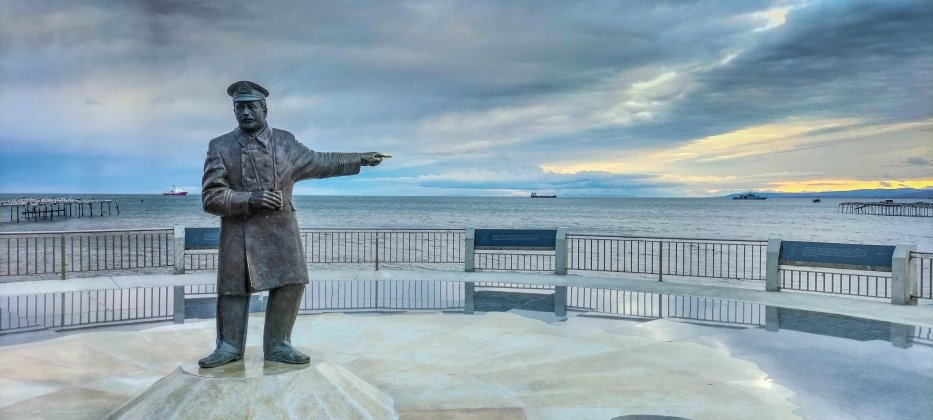 | Die Statue von Ernest Shackleton zeigt Richtung Südpol. Diesen hat er nie erreicht, aber er leistete übermenschliche Anstrengungen bei der Rettung seiner Mannschaft vor Elephant Island. |