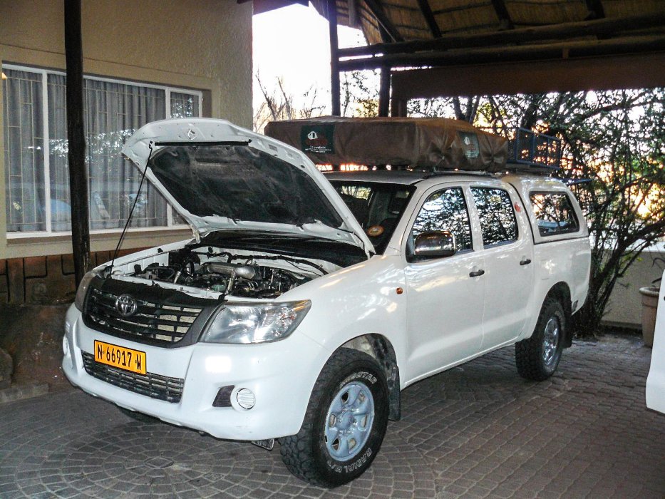 unseren Hilux mit Dachzelt, Campingausrüstung, Kühlschrank und 40 Liter Reserve Wasser. Wir leihen uns den