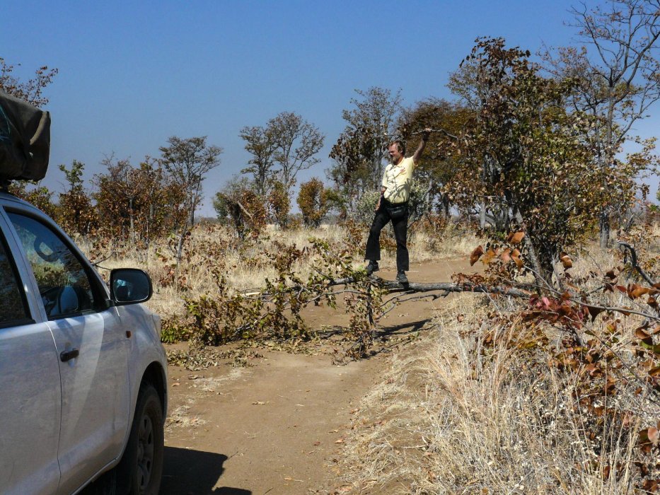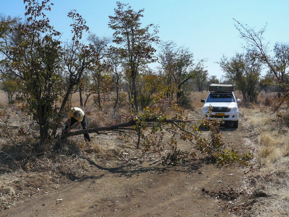 | Die Elefanten legen oft Bäume um und versperren die Piste. | |